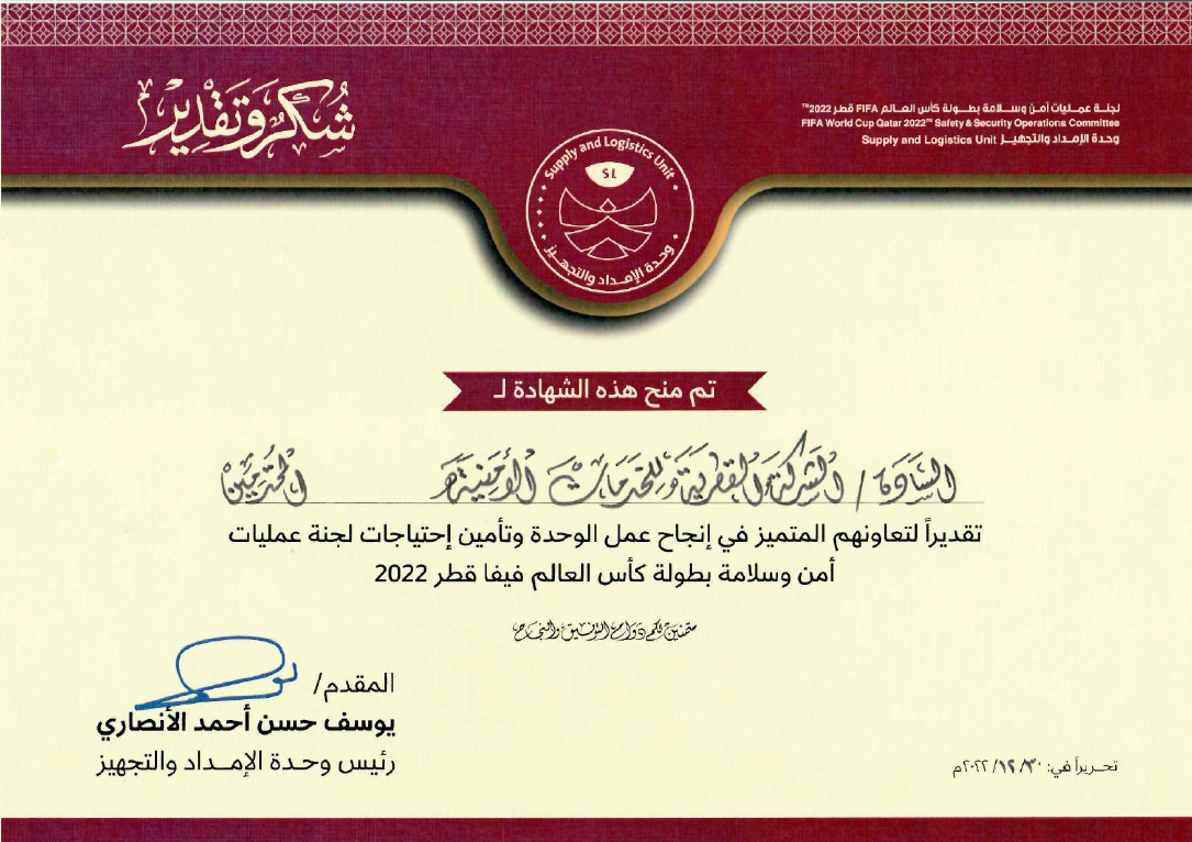أثنى الفيفا على التزامنا وقدرتنا على توفير الأمن المؤهل، مما يساهم في ضمان بيئة آمنة ومنظمة.